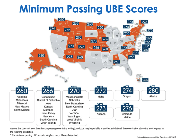 每一個採用UBE考試的州,可以自行訂定錄取的分數線,紐約州的通過分數線為266。如果成績夠高,而且也具有其他州要求成為律師的資格要件,可以申請transfer the UBE score讓別的州採認,就不需要考很多次律師考試。以下是各州通過UBE 考試的成績,沒有標示的州則是不採用UBE 考試的州。